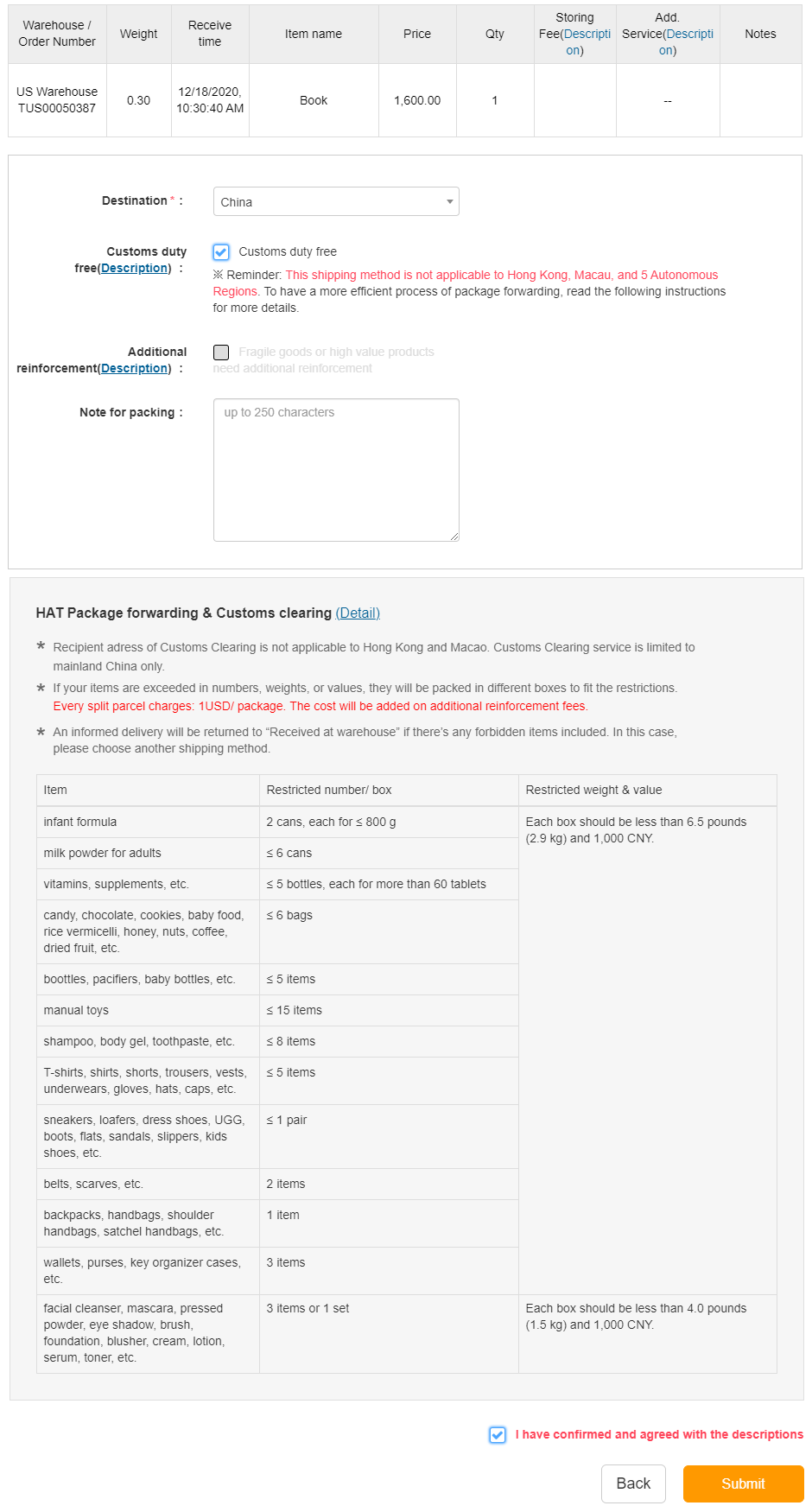 If your items are exceeded in numbers, weights, or values, they will be packed in different boxes to fit the restrictions. An informed delivery will be returned to “Received at warehouse” if there’s any forbidden items included. In this case, please choose another shipping method. |