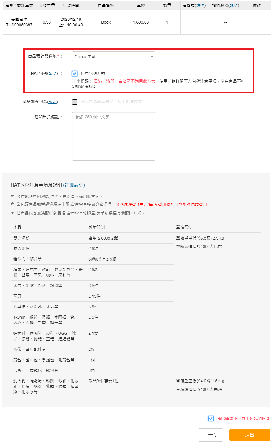 (僅有此步驟可選擇包稅,如事後更改,會加收10美元的重新捆包費)